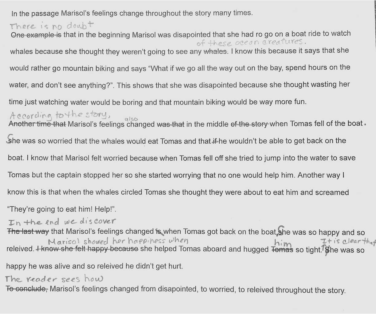 To teach revision, use a whole class model. Project the sample for revision and discuss the strengths and weaknesses of the piece. Choose one skill that will address the weakness and with student participation, go through the revision process. This allows students to see revision in action and provides a structure for their own revision process. Using the suggested feedback from above, here is an example of a revised version of this piece. (NOTE: the typos mirror the student sample.)
