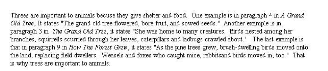 - Sentence starters: The evidence is framed by sentence starters to indicate the name of the article and the paragraph where the text support came from: “One example is in paragraph 4 in A Grand Old Tree…” Another example is in paragraph 3 …” The last example is that in paragraph 9 in How the Forest Grew…”